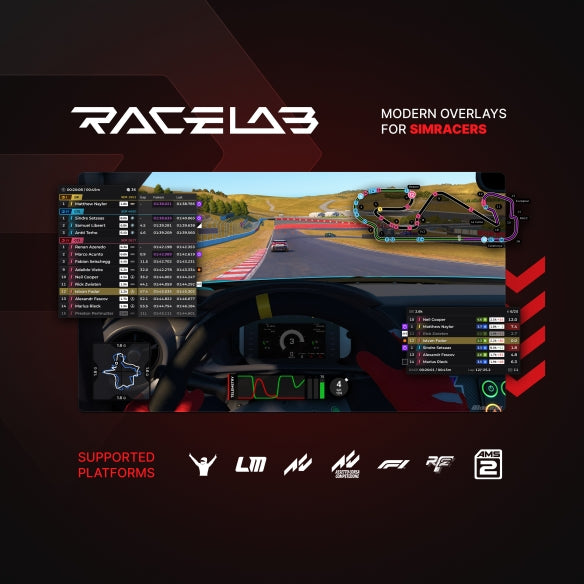 RaceLab is a suite of tools designed to improve your sim-racing experience, including overlays to fine-tune your driving, intelligent layouts which adjust to the cars you race, a comprehensive community-driven layout library, rich data for iRacing series, dedicated streaming tools and more.